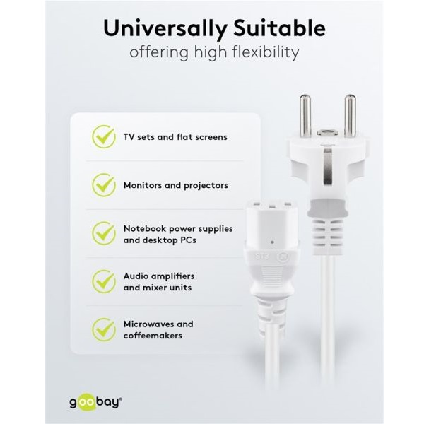 • Netzkabel geeignet für z. B. PC, Monitor, Beamer oder Laptop und andere Geräte mit einem Kaltgerätestecker C14