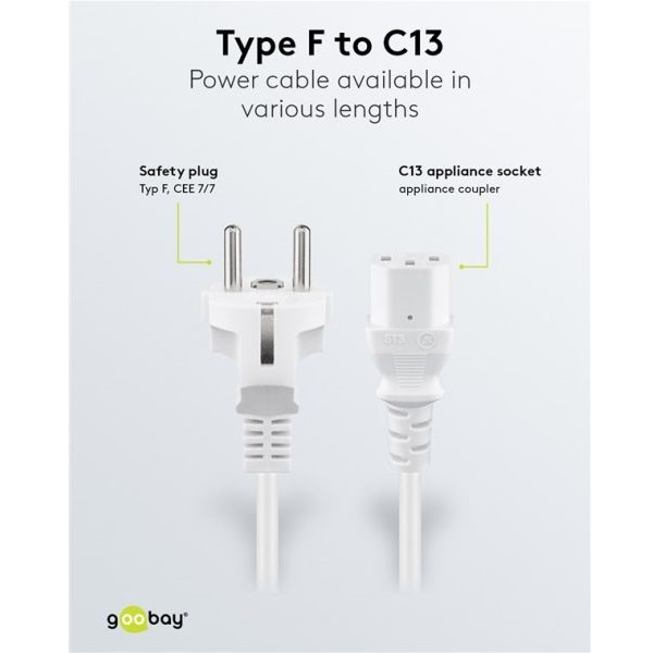 • Netzkabel geeignet für z. B. PC, Monitor, Beamer oder Laptop und andere Geräte mit einem Kaltgerätestecker C14