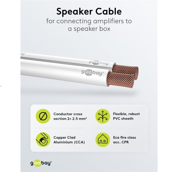 - Lautsprecherkabel mit hochwertiger Litze (CCA: Copper Clad Aluminium) für gute Übertragungseigenschaften z. B. zwischen Hi-Fi-Anlage und Lautsprecher