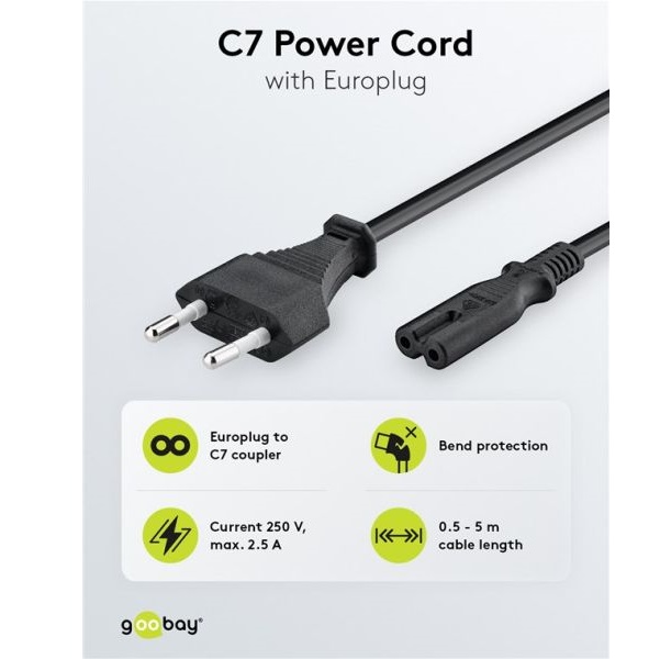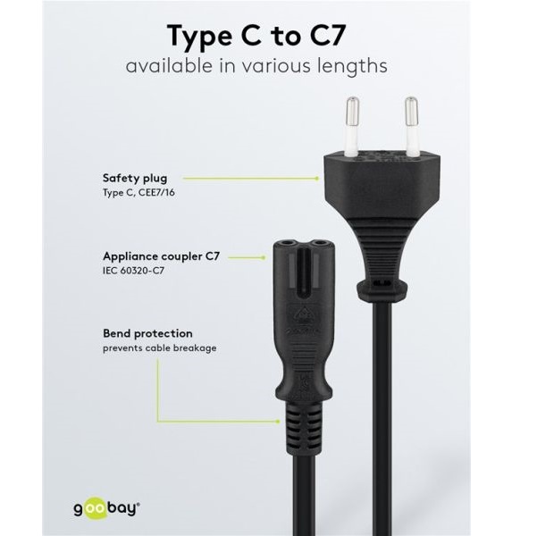 - 2-poliges Netzkabel mit Kleingerätekupplung zum Anschluss an viele Haushaltsgeräte