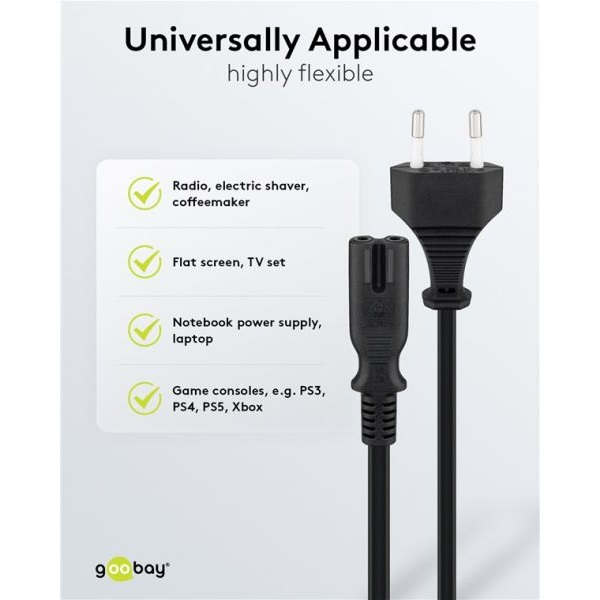 - Universell einsetzbar als Stromkabel oder Anschlusskabel an Geräten ohne Schutzerde (GND) und max. 2,5 A Belastbarkeit