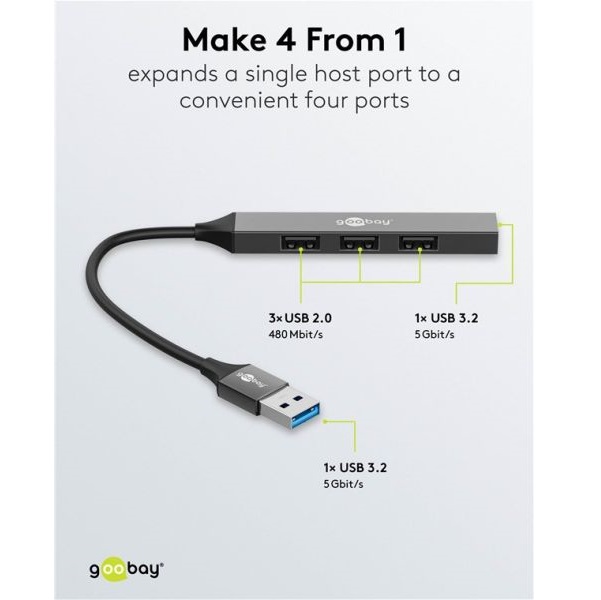- Über den Anschluss mit USB 3.2 unterstützt der USB Verteiler SuperSpeed-Datenraten bis zu 5 Gbit/s, über die übrigen drei Eingänge mit USB 2.0 jeweils bis zu 480 Mbit/s
