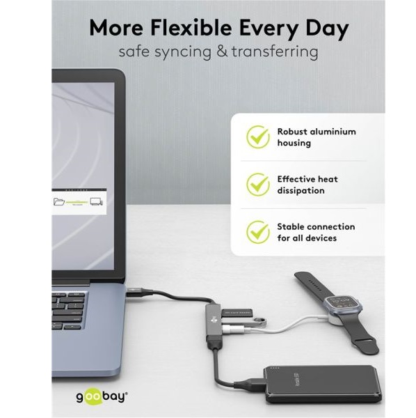 - Im extrakompakten Slim-Format passt der Hub in jede Tasche und wird unterwegs oder auf Reisen zum praktischen Begleiter
